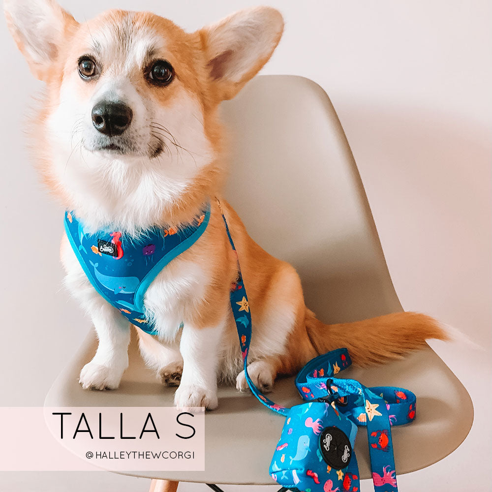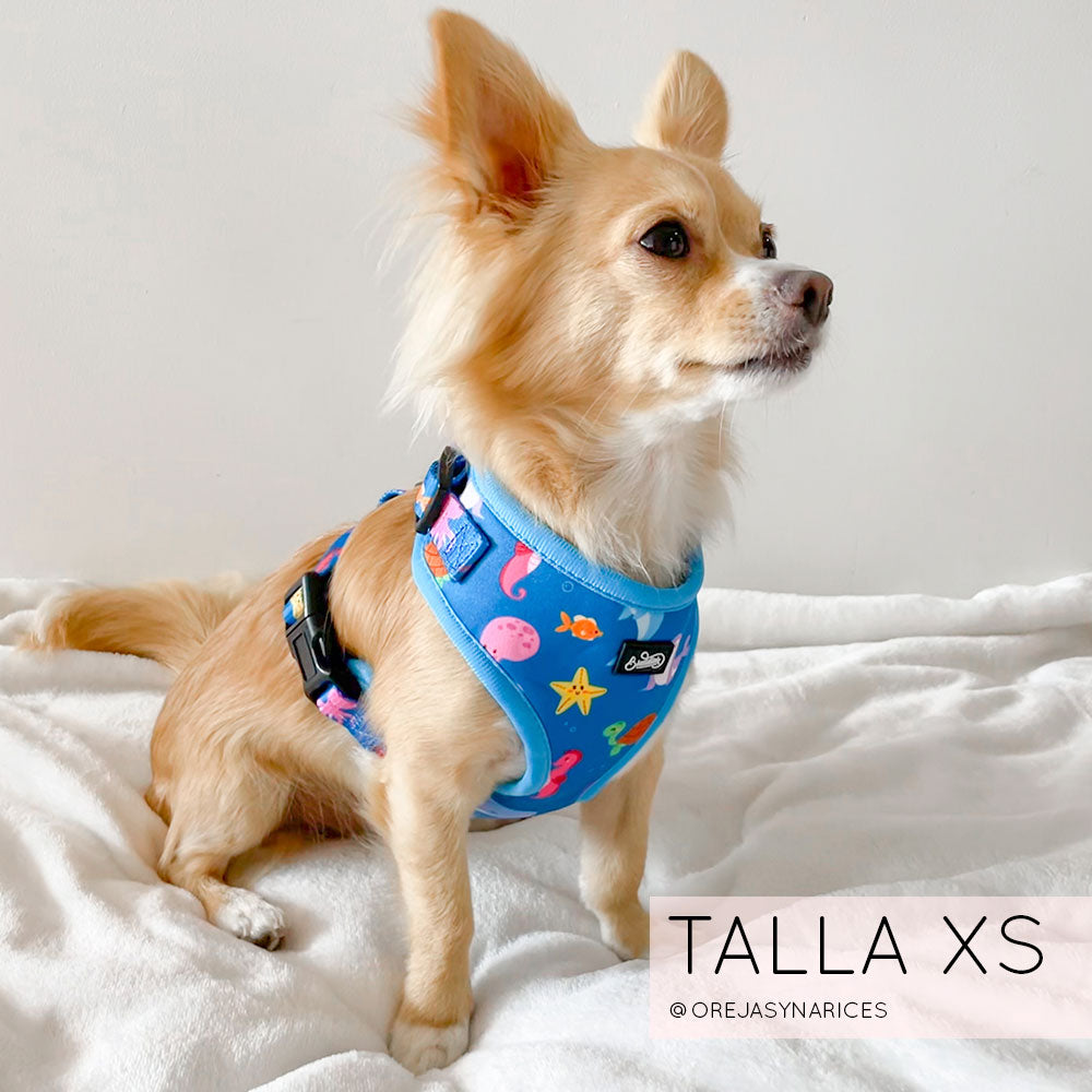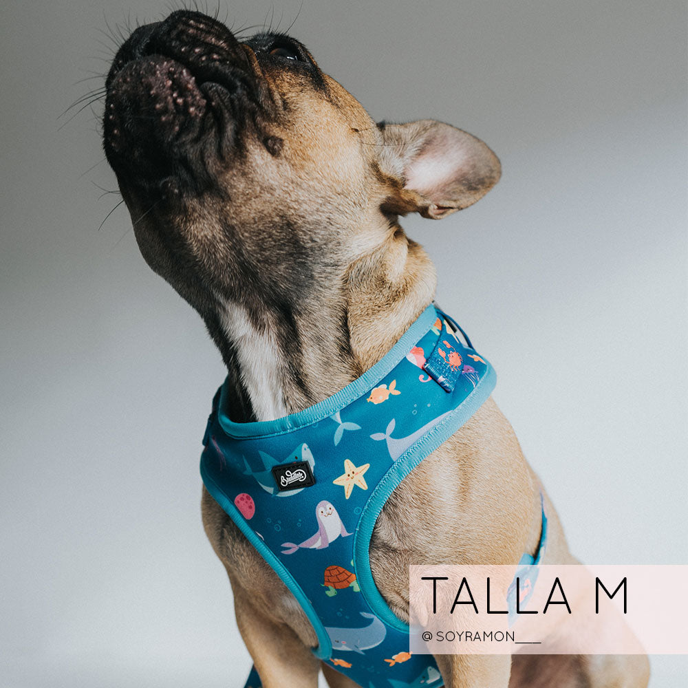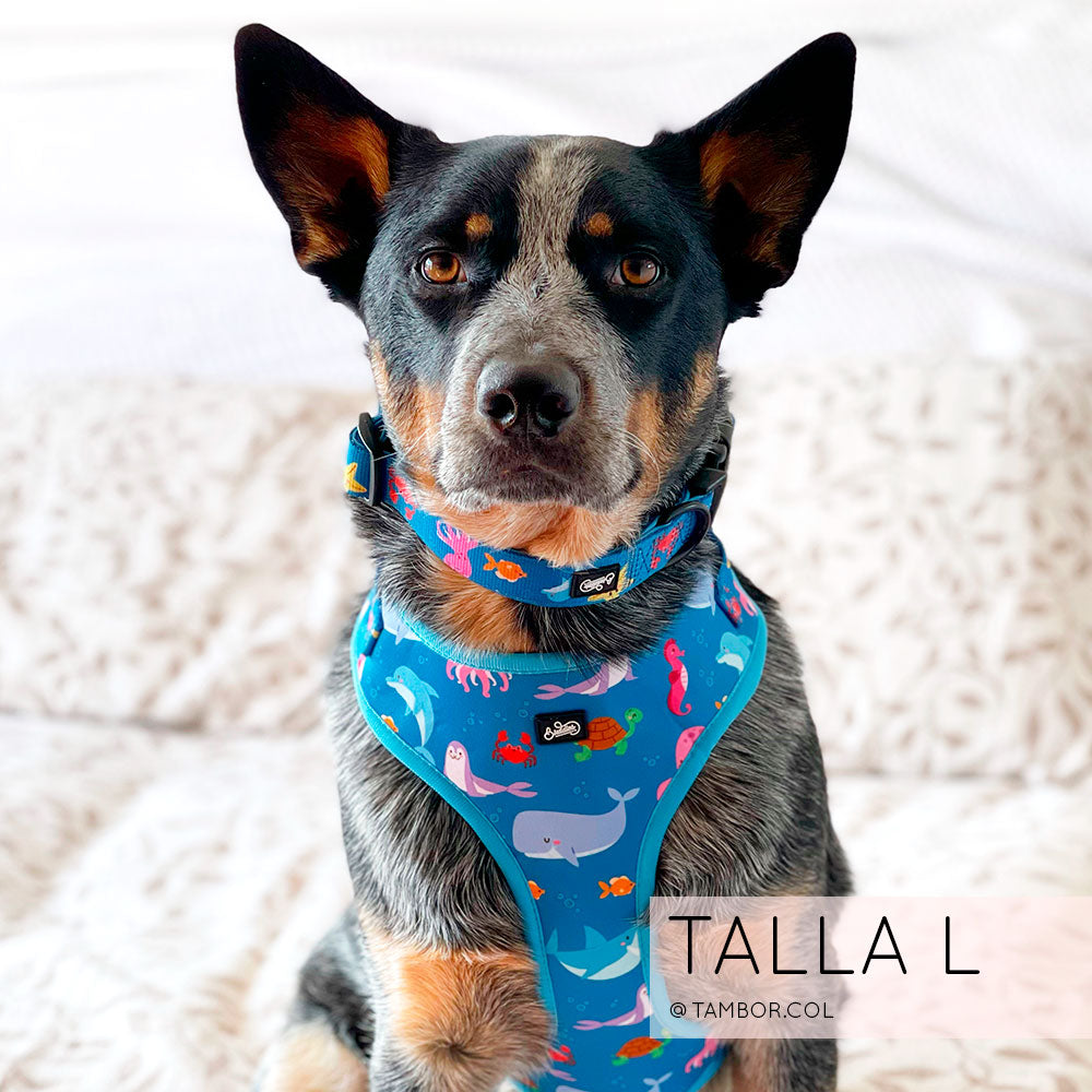Nuestra pechera Bajo el Mar es completamente ajustable tanto en el cuello como en el pecho para que le quede perfecta al cuerpito de tu peludito!
