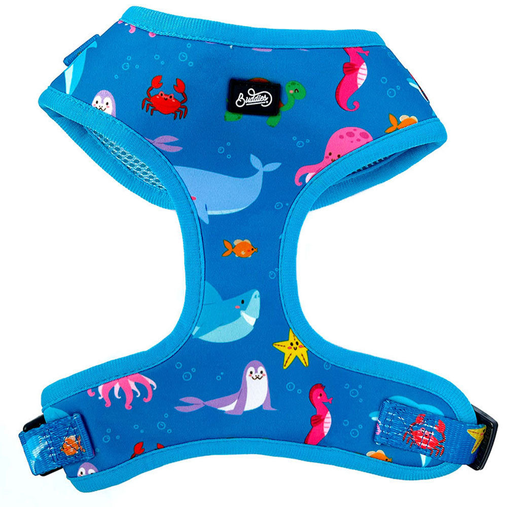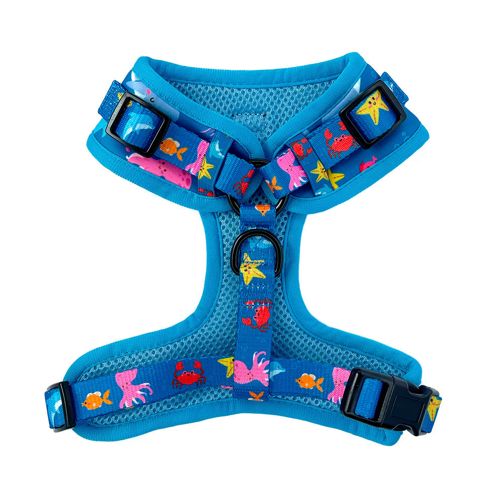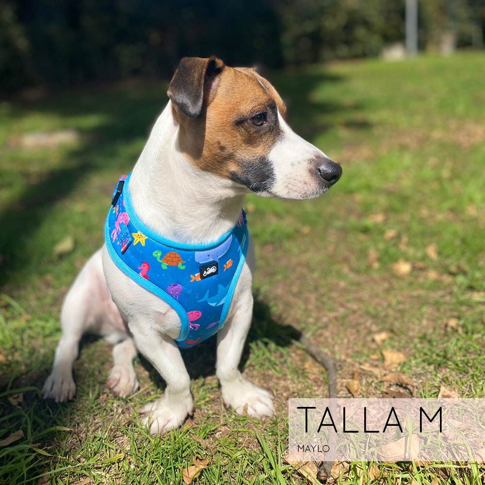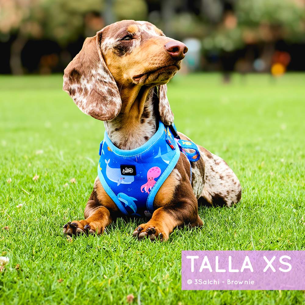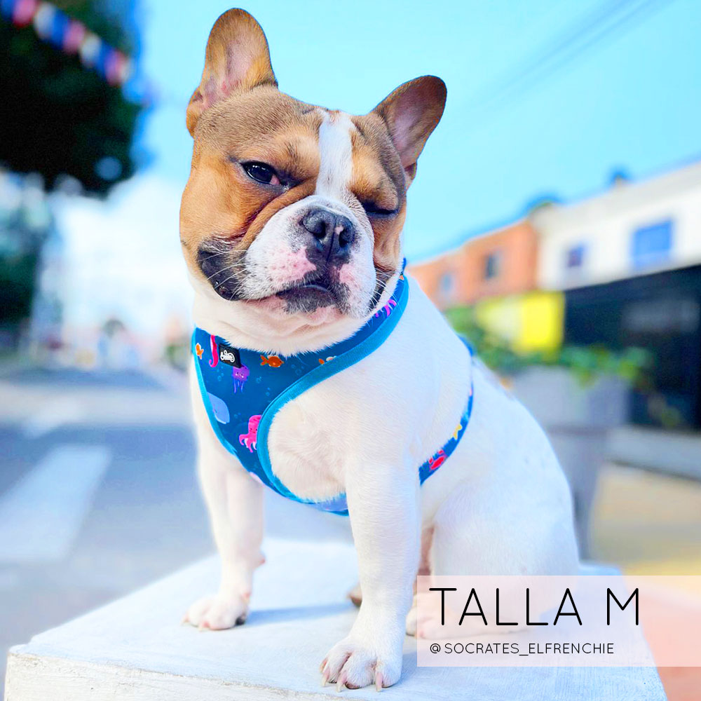 Nuestra pechera Bajo el Mar es completamente ajustable tanto en el cuello como en el pecho para que le quede perfecta al cuerpito de tu peludito!